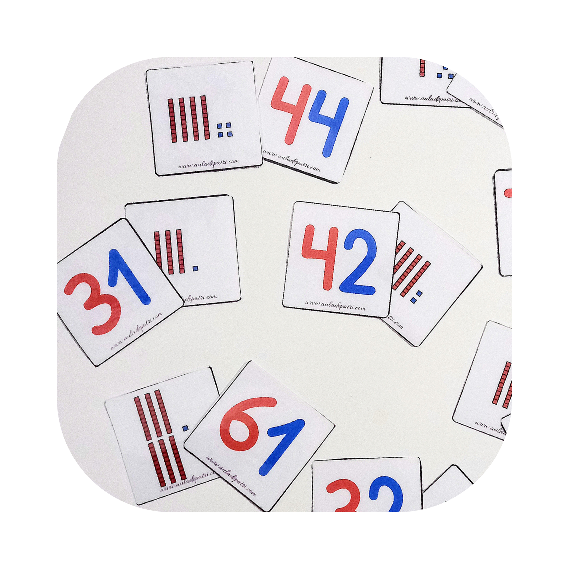 En los números las unidades aparecen en azul, las decenas en rojo y las tarjetas del 10, 20, 30… tienen el fondo amarillo.