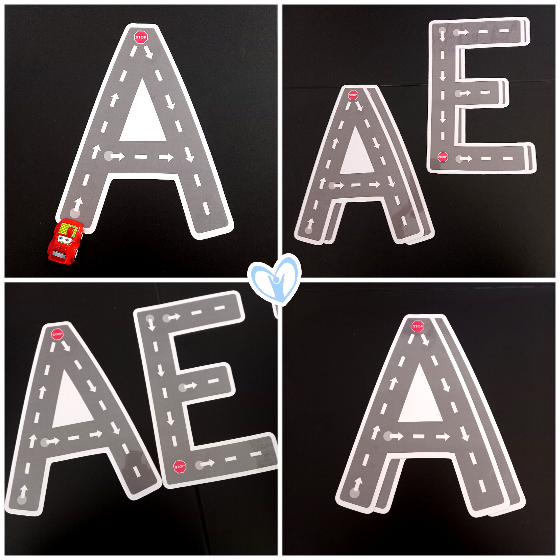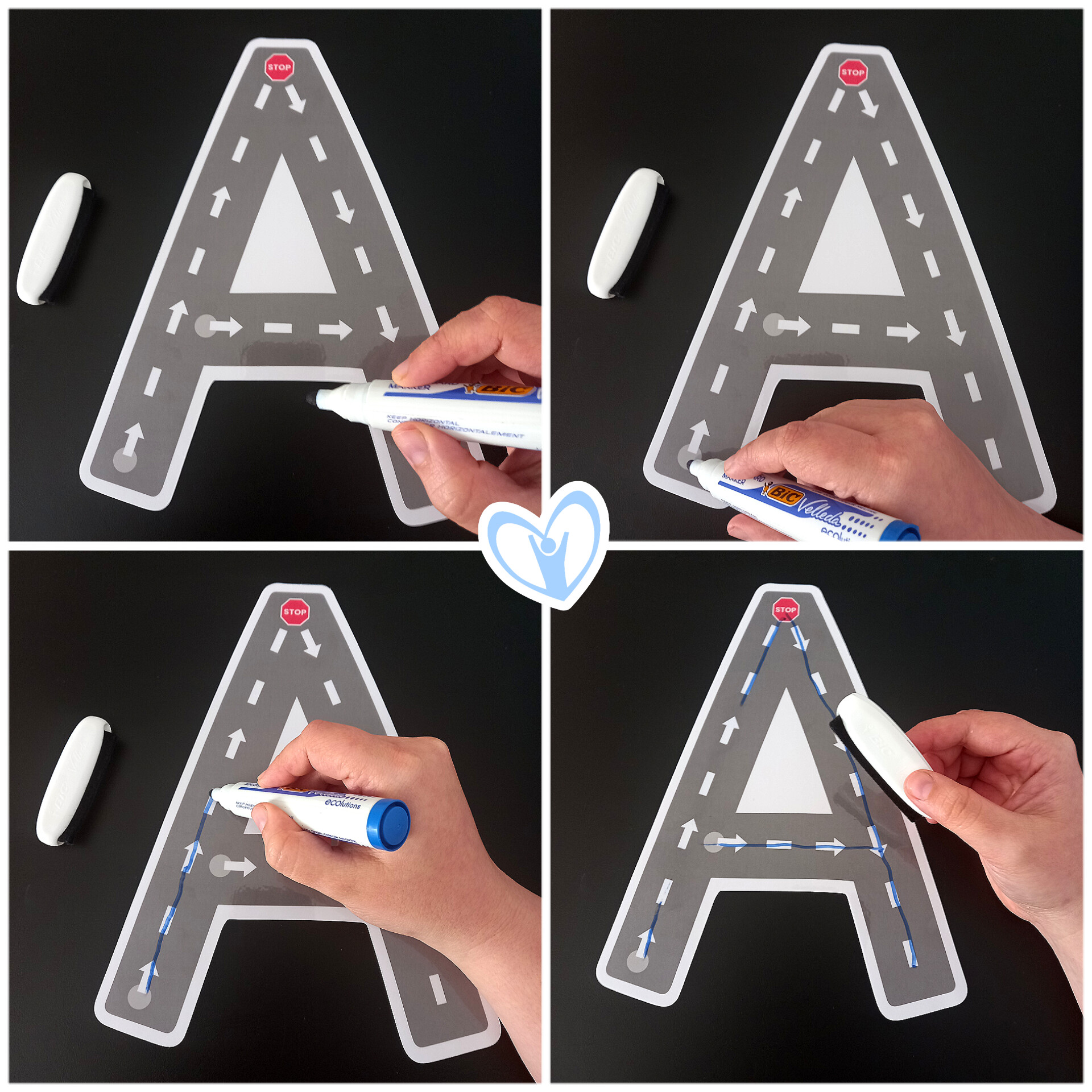 Recurso para aprender el trazo de las VOCALES EN MAYÚSCULA de forma divertida y motivadora con un coche de juguete. Además utilizo este recurso con un rotulador blanco de tiza líquida.